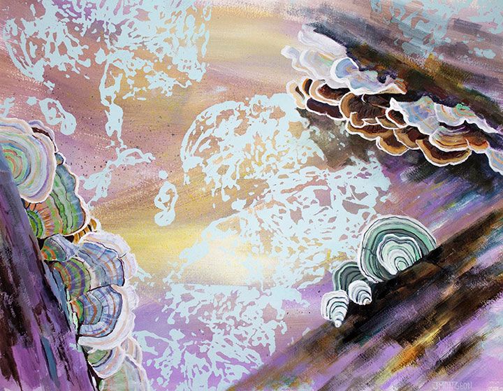 My artwork is an invitation for viewers to encounter nature through the lens of my experiences and imagination. I often include circular brushstrokes that evoke the striations found in mushrooms, geodes, bisected tree trunks or shells. I am fascinated by the visual similarities found in nature, including within the human body. For example, a branching fractal pattern can be found in human veins, neurons, tree branches, river deltas and lichen. By combining these observations, I demonstrate how humans and nature are interconnected.