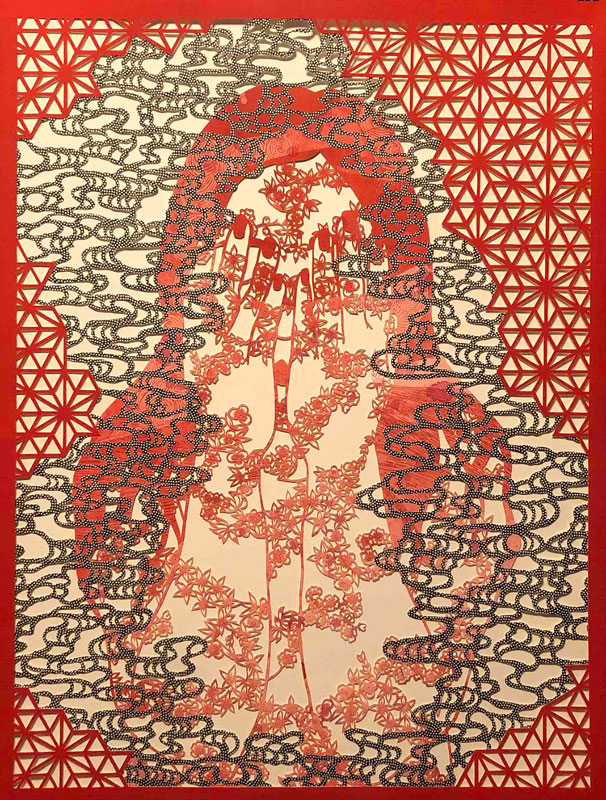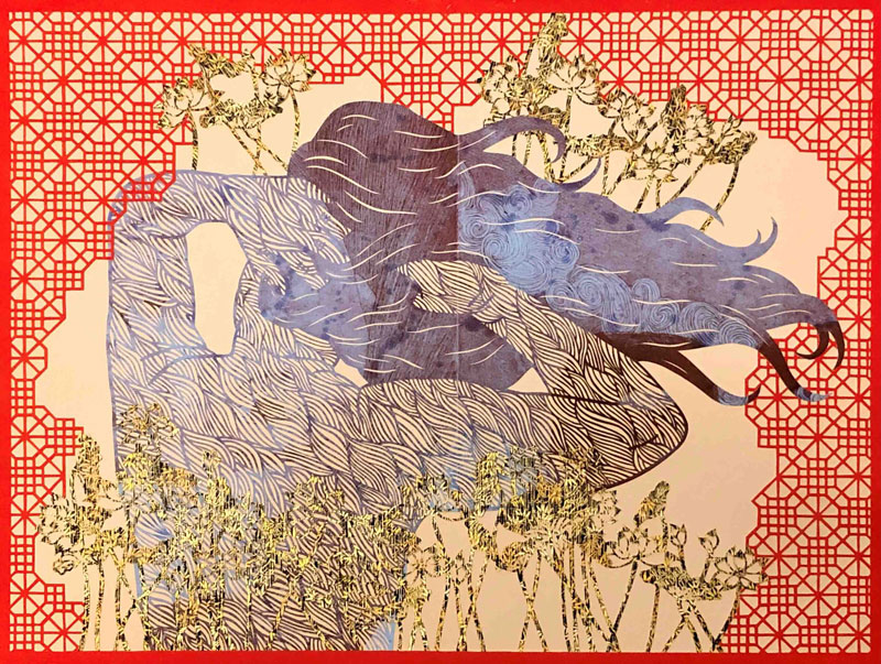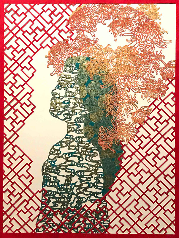 My artwork is influenced by the crisp graphic appearance of the Chinese folk art of paper cut as it appeals to my sensibility as a printmaker. It is a blending of my interpretations of traditional Chinese designs into personalized figurative compositions. The paper cut designs appear as textures and patterns that meld and surround the figure. The combination of the paper cut with other media shifts the idea of space to be both dimensional and flat. The use of pattern (printed and cut out) depicts the figure as it exists in an ephemeral state, in a place between reality and the mystical. The delicate lines merge with bold shapes and color to create visual movement and vibration. The combination and interaction of the layers of paper cuts create complex and unpredictable visual space and depth.
