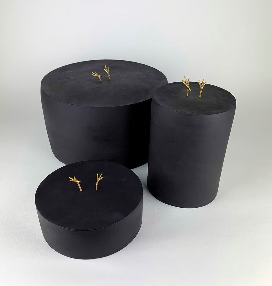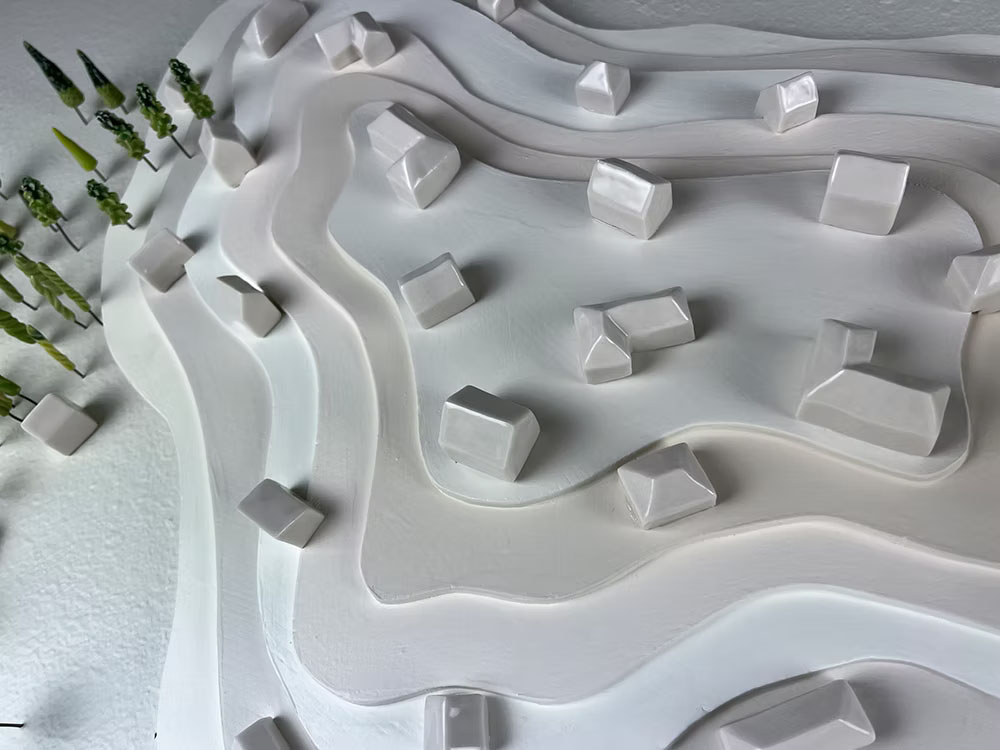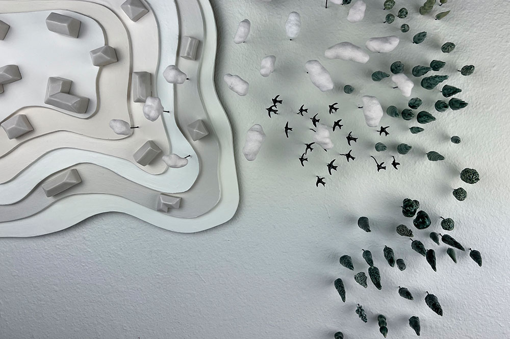 “I remember Chaney Jewell (Arkansas exhibit curator who was then at the Arts & Science Center for Southeast Arkansas in Pine Bluff) reaching out to me to be part of the Arkansas Committee’s exhibit,” said Papazian. “I was trying to work in my basement studio — this was in full COVID era — and I was making this weird piece that I wasn’t even sure was a piece. I spent a couple of months just making tiny ceramic ‘trees,’ trying different glazes and sticking them into my wall. I remember feeling very disconnected from the world that COVID had fully turned upside down. I sent her images and my statement describing it as an escapist alternative land using elements borrowed from maps and architectural models, and I remember thinking, well, maybe this is a piece.”