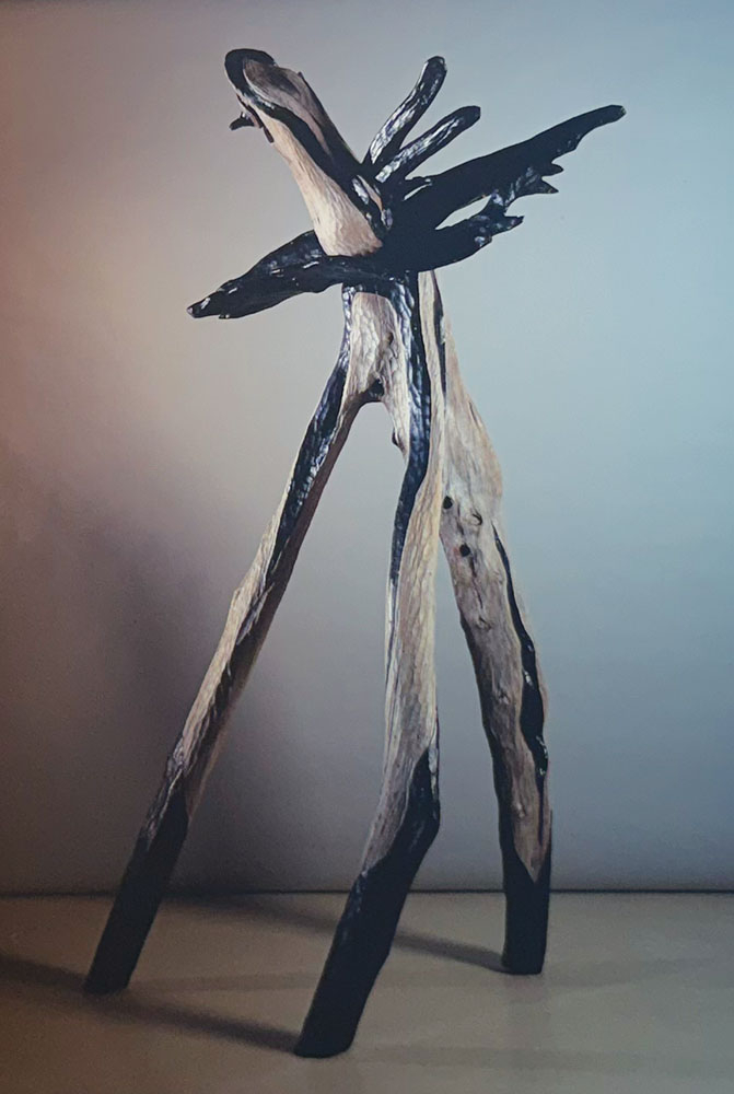 Her work exhibited at NMWA was MAMBO, an inverted cedar tree with an oak collar and cedar head. She says being included in this show provided validation for her work and served as a propellant for her career, which she describes as an organic evolution.