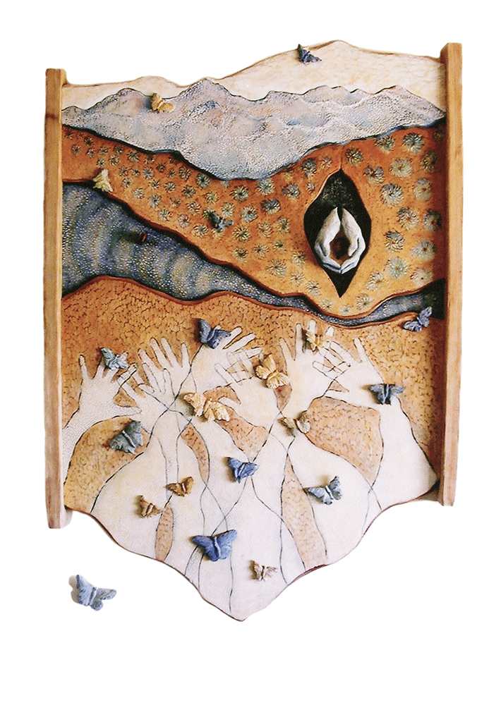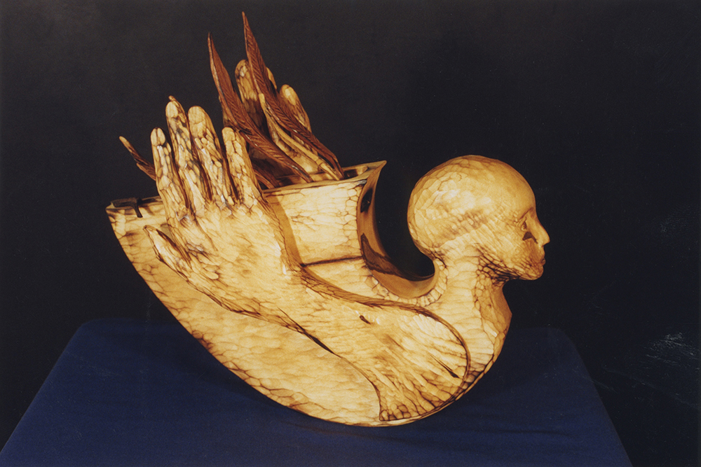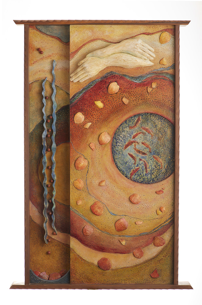 “I had moved from metal to mixed media, but when I relocated to Arkansas, I was somehow called to begin working with wood,” she said. “I got some tools and started carving. This piece just came out and evolved. I had done some work with hands because I find them so interesting, and the wings and feathers somehow appeared as I went along.