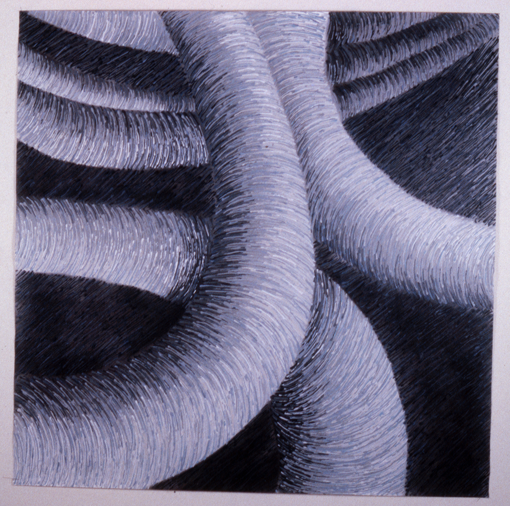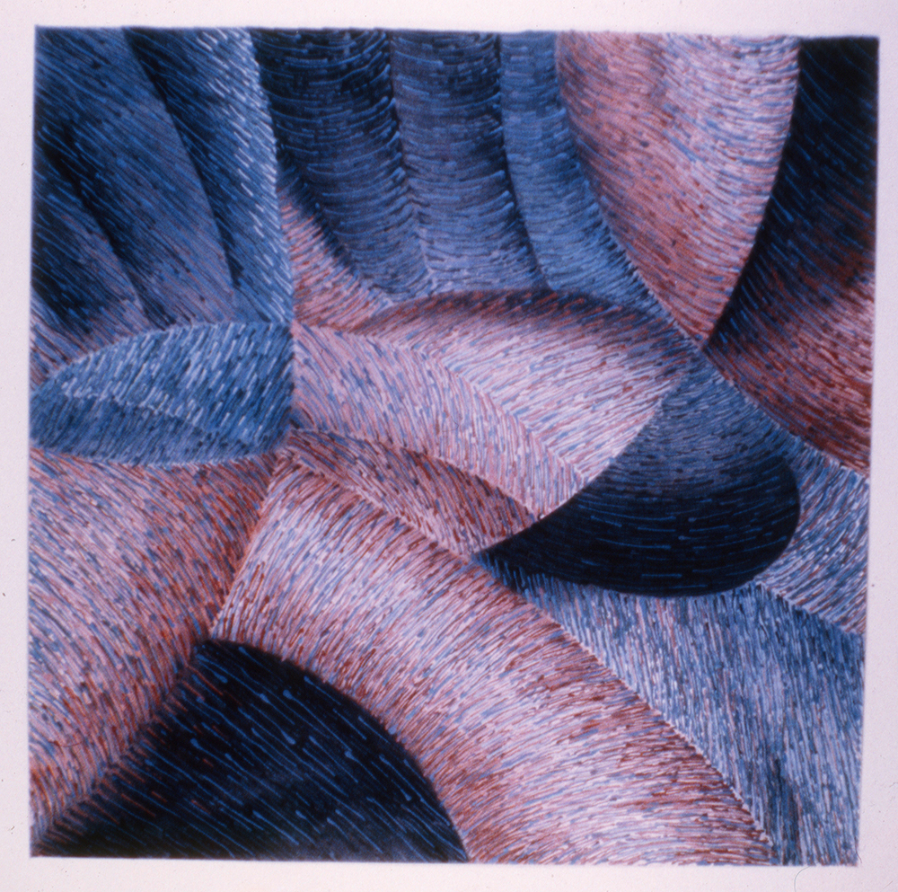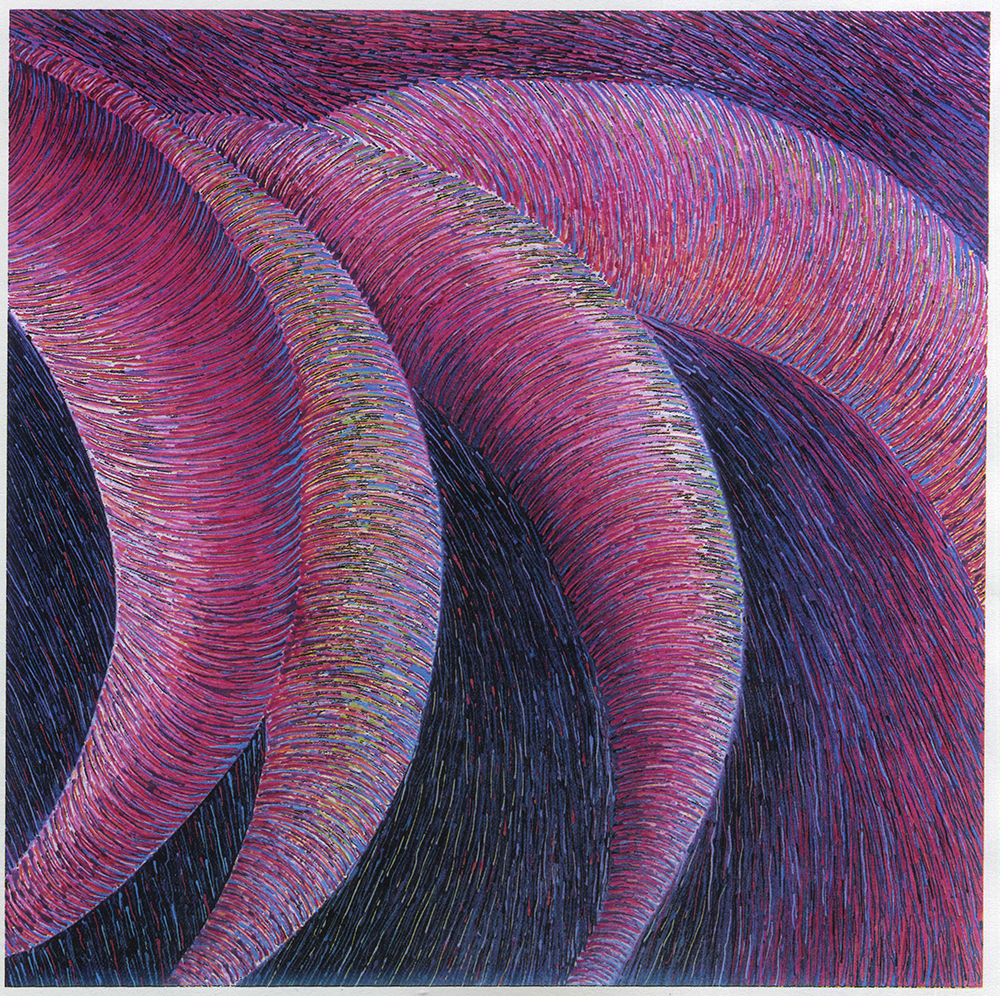 Despite having macular degeneration, Mayes continues to make art today. “I have had to develop new ways of painting that are dominated by muscle memory,” she said. “My experiences with kinesthetic motion in making art have been helpful for me to understand how my arm and hand are painting without being able to see exact detail.”