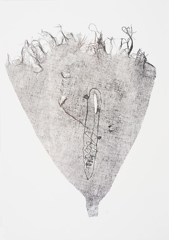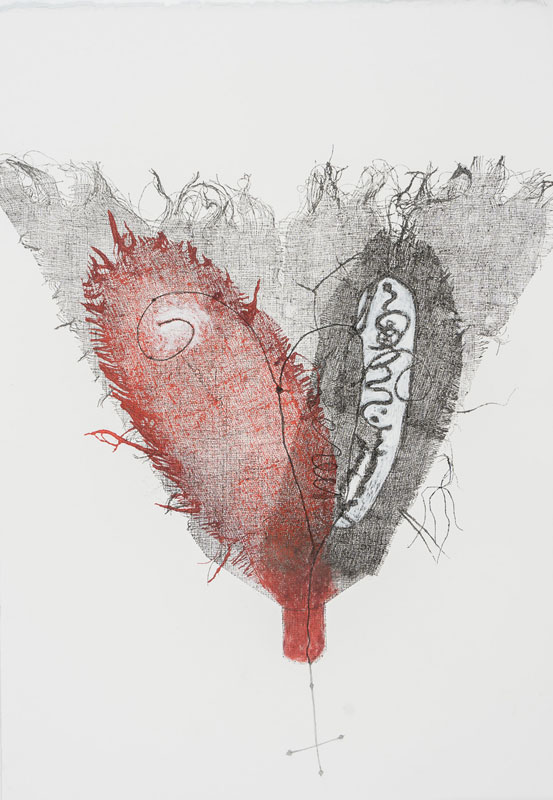 The forms in these four collagraphs approximate female morphology and signify the feminine life-force. As seen in the works Flask and Tabernacle, the ragged threads simulate body hair and the openings within the forms are intimate portals to the sacred female. The stitched openings can refer to the consequences of childbirth, but for me the stitches more appropriately represent coils of DNA that pass information to the next generation. The structures in both pieces are like funnels or flasks, but the shapes and the contents are organic and refer to biology. Seeded Cloud with Boat is about the persistence of life, of organisms that are everywhere, not seen by the naked eye but become macro through the imagination of the artist. The boat is a womb carrying new lifeforms to a distant shore. The work, Containment Vessel and Witch Hat, is how the female biology has been seen at times as something to be feared, controlled, and demonized. For me, the witch hat is a symbol of resilience, defiance and intelligence.