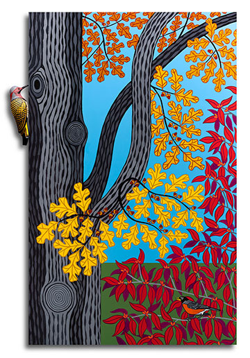 My garden is my connection to nature, an ever-changing art installation, open-air studio, and the focus of my paintings. It is a humble, Southern backyard garden resembling a “crazy quilt” of color and pattern. My major aesthetic concerns are color, space, pattern and composition. Saturated, contrasting hues are used to enliven and flatten the abstract space. The shallow space is full of patterned plants and hard edged, flat shapes stacked on an up-tilted plane. The surface composition is often a larger overall pattern. Matte acrylic is applied flatly to emphasize these formal concerns.