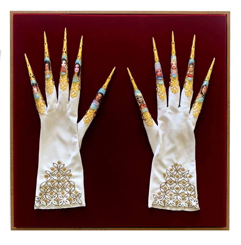 Vintage Cotton Gloves, embroidered, with Collaged Metal Nail