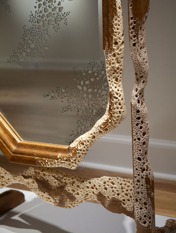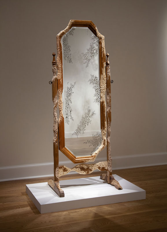 I remember when the gallery reached out, I was hesitant to accept, unsure if I would physically be able to install my work. The prospect gave me an overwhelming motivation to focus on my healing and dietary adjustment so I would be ready. I was able to finish a new piece in my series, The Break Down titled, “Osteoporosis: Mirror.” In this piece, I combined my traditional wood carving techniques and incorporated digital fabrication to etch the mirror with a CO2 laser so the viewer could see through the mirror.