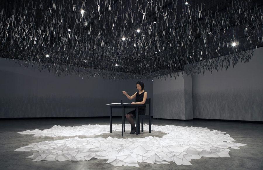 Installation and Performance, scissors, thread, table, chair, hardware