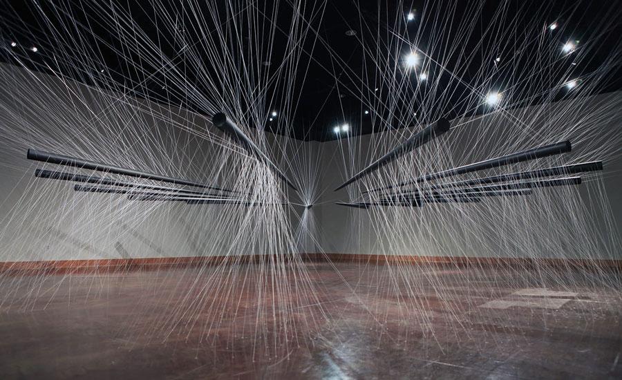 Installation, wood, graphite, cotton string, hardware