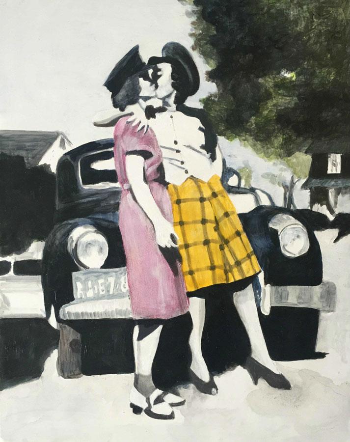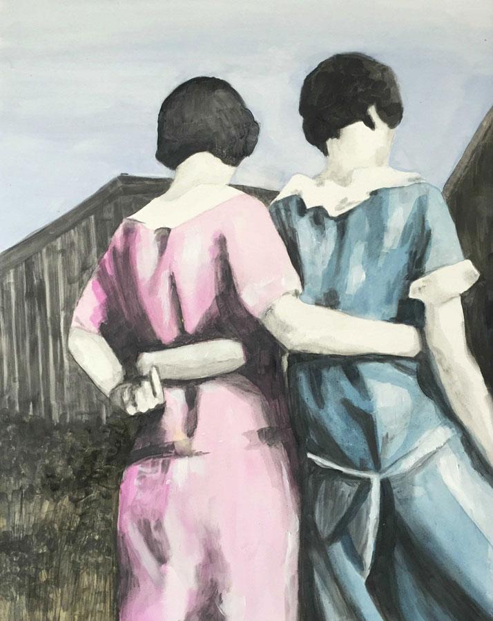 The “Friends and Lovers” mixed-media series represents images of love that are normally historically invisible. Based on anonymous found photographs, the small paintings depict same-sex female couples from different historical time periods. The titles in the series allude to captions normally written on family photographs and ambiguously address the relationship between the two women shown. This is purposeful as historically same-sex relationships are ignored or relabeled by family or friends to avoid direct acknowledgement. Representation of diversity is vital to our understanding of the world and in creating empathy. Lesbian artists have traditionally avoided representation of the lesbian body or of lesbian love to avoid issues with male gaze, homophobia, or associations to pornography. The Friends and Lovers series seeks to show relationships in a tender and natural way, leaving room for the viewer to understand the relationship presented in on their own terms.