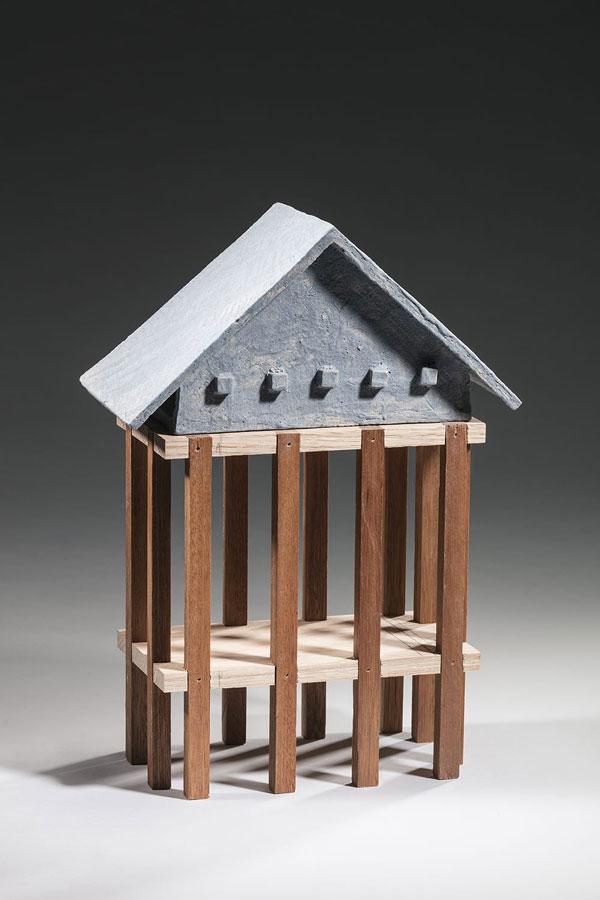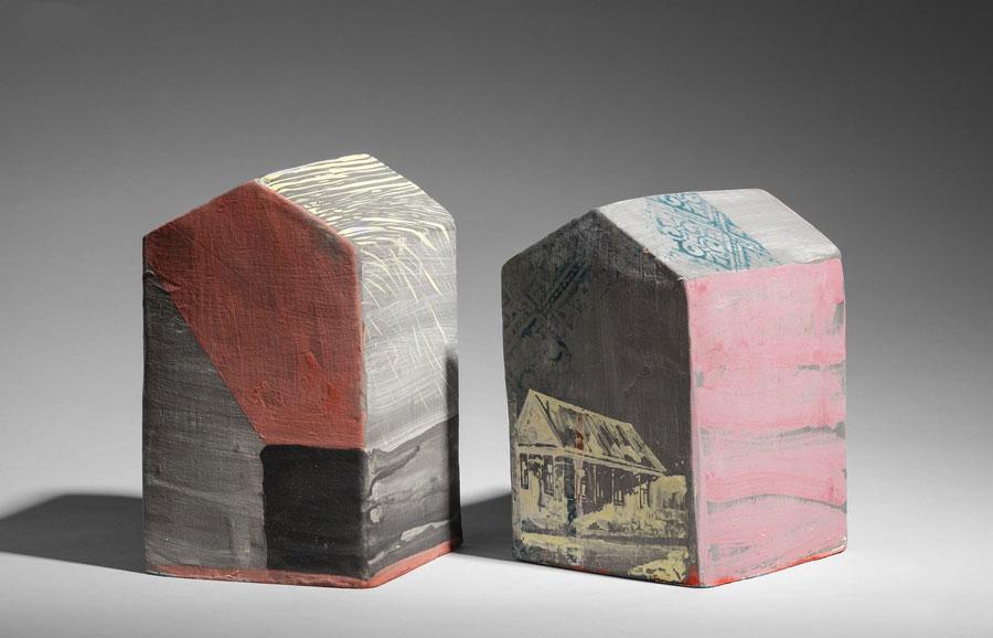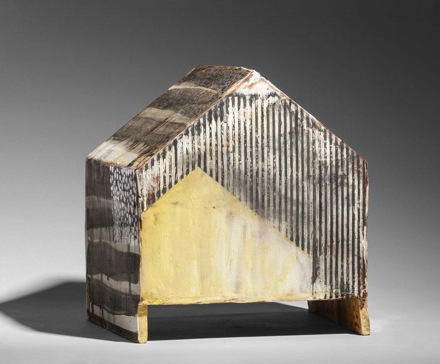 My interest in clay is visceral. It has been my preferred medium since the first time I touched it. I have been exploring concept of home as a fragile state of a tangible structure and of a social contract. I reflect on my personal experience as a child and as an adult. I use textures and colors produced in soda kiln as meditation on the irrepressible and inevitable. Hard slab construction is perfect for creation of house forms. Geometry is important as part of strength, durability, and necessary balance. The bases for the “houses” are tall and airy, reflective of common frame construction. The height of the framing is meant to elevate the structures and create a sense of delicate equanimity.