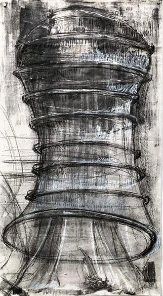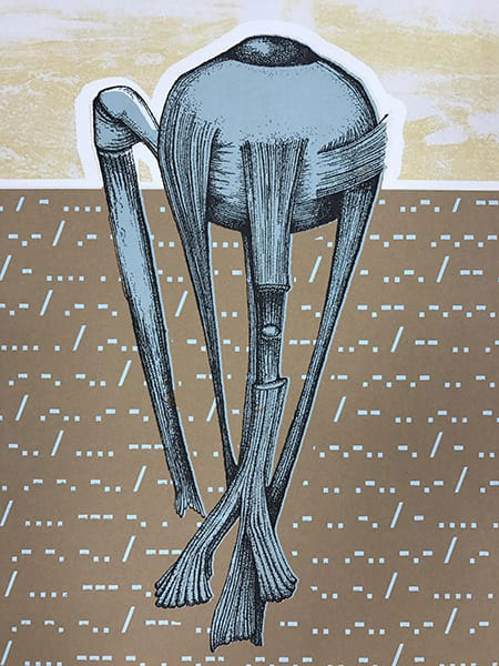 Fragile Japanese papers are often contrasted with dense German etching cotton rag and paired with layers of both transparent ink and bold gesticular marks to create my printed media. Digital and hand-drawn forms are discovered ranging from biological to the mundane. These anthropomorphs are distorted as they move through waves and ripples of colors and textures, and are juxtaposed with static architecture as monuments to the Feminine.