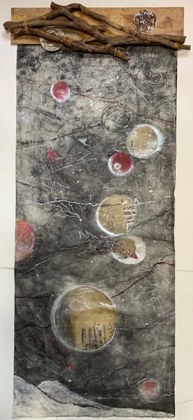 Mixed Media: monotype with gel pen, fabric & photo on tissue collage, graphite, oil pastel, branch, metal