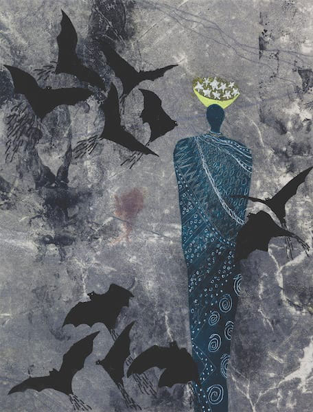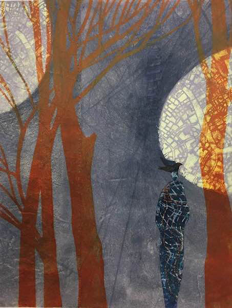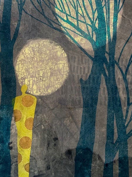 Making my art is a dialogue between me and the process and the materials. I begin with a loose notion of something and then put a mark or an image on canvas or paper or a printing plate. I often gather materials to assemble, and then they guide me in where to go next. It is a constant dialogue with many changes and surprises along the way. Layers form and weave, revealing some secrets and concealing others, offering little glimpses of things and reflecting my own curiosity and sense of exploration. Everything progresses until it finally tells me “enough!” Then hopefully I have enough sense to stop and let it sit a while. Sometimes it truly is enough, and sometimes it tugs me with just the final little thing it needs for completion.