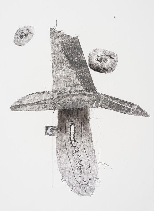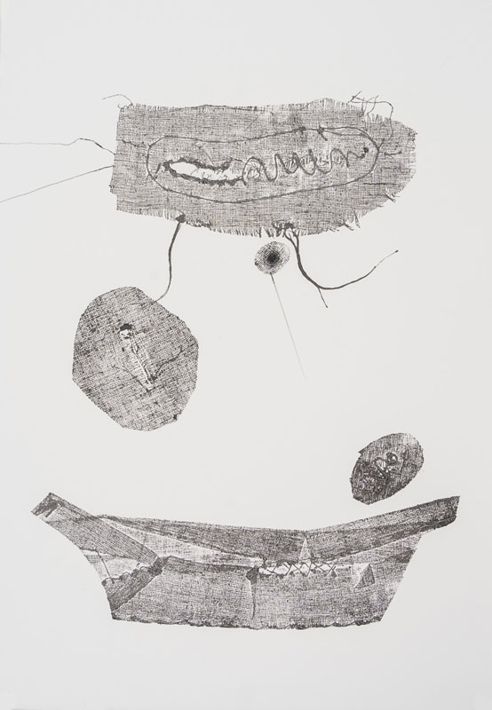 The forms in these four collagraphs approximate female morphology and signify the feminine life-force. As seen in the works Flask and Tabernacle, the ragged threads simulate body hair and the openings within the forms are intimate portals to the sacred female. The stitched openings can refer to the consequences of childbirth, but for me the stitches more appropriately represent coils of DNA that pass information to the next generation. The structures in both pieces are like funnels or flasks, but the shapes and the contents are organic and refer to biology. Seeded Cloud with Boat is about the persistence of life, of organisms that are everywhere, not seen by the naked eye but become macro through the imagination of the artist. The boat is a womb carrying new lifeforms to a distant shore. The work, Containment Vessel and Witch Hat, is how the female biology has been seen at times as something to be feared, controlled, and demonized. For me, the witch hat is a symbol of resilience, defiance and intelligence.