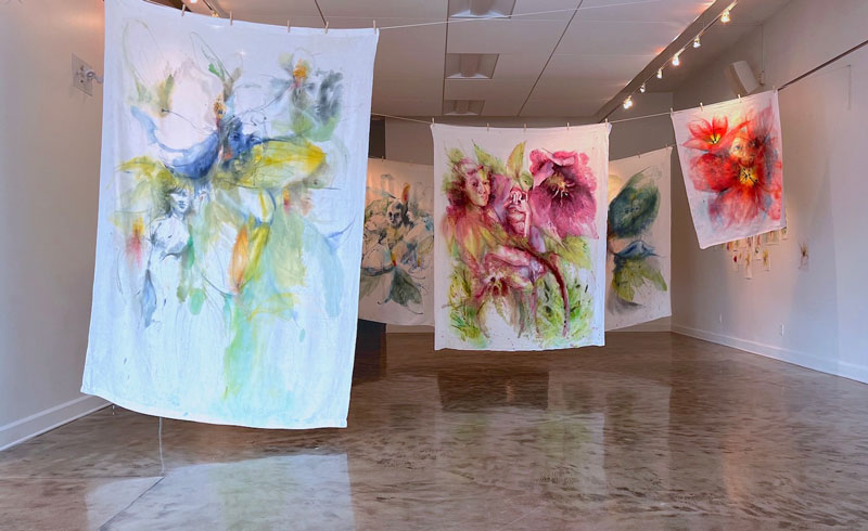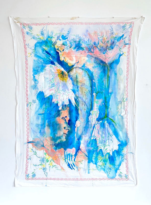 When the pandemic began, while home bound, I surprisingly found solace in observing and painting flowers in watercolor as they took turns blooming. I have obsessively painted flowers each Spring since. I realized one reason it made me feel so good was the connection I felt to the women in my family who came before me, so I set out to explore the influence and connections to my maternal lineage. Working from the many flower studies, combined with sketches from old photos of myself, my mother, grandmothers and great grandmothers, I create large paintings on inherited old tablecloths to draw attention to undervalued domestic work. This most recent work examines the connections and differences between the lives my female forebearers and I have led, while reflecting broader social changes.