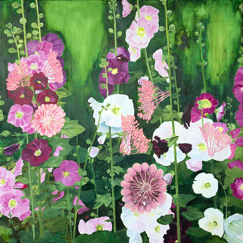 These paintings are inspired by my experiences with motherhood and pregnancy as the mother of two children. After my son’s birth I made prints of the placenta and umbilical cord by pressing them onto pieces of paper. I was amazed by the size and complexity of this temporary organ that my body produced to sustain the life of my child. I created a silkscreen by tracing the placenta print, which forms the unifying element of these paintings, printed in a light green hue, and camouflaged with lichen, mosses and mushrooms in an imaginary environment. My recent work features illustrations of mammary glands amid fields of flowers to celebrate breastfeeding and the role of mothers in the cycle of life.