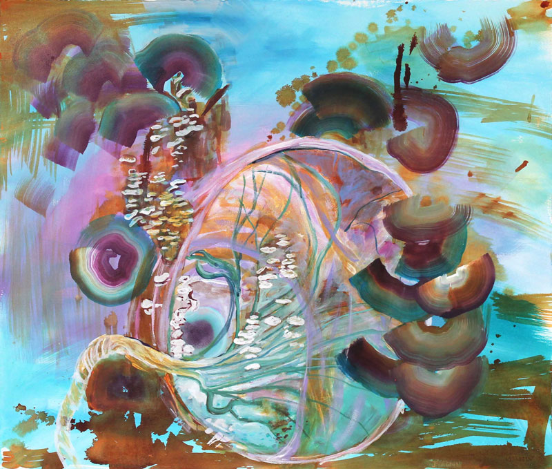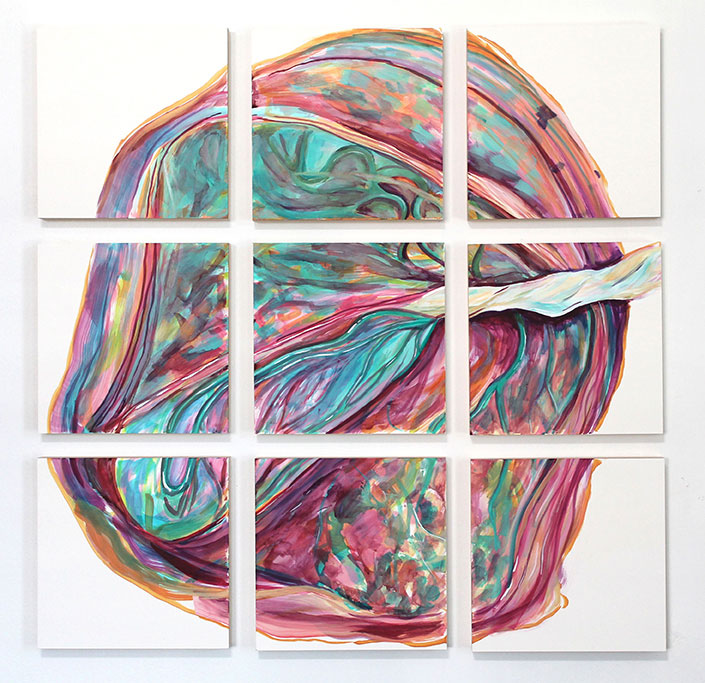 My artwork is an invitation for viewers to encounter nature through the lens of my experiences and imagination. I often include circular brushstrokes that evoke the striations found in mushrooms, geodes, bisected tree trunks or shells. I am fascinated by the visual similarities found in nature, including within the human body. For example, a branching fractal pattern can be found in human veins, neurons, tree branches, river deltas and lichen. By combining these observations, I demonstrate how humans and nature are interconnected.