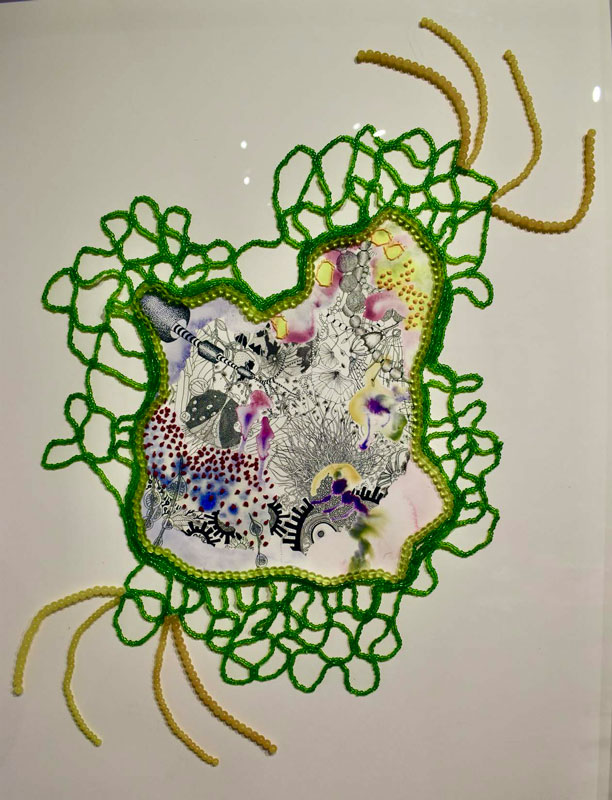 Viewing my work transports the viewer into an illusory world of biomorphic forms inspired by recent innovations in applied science, the human body and its surroundings. The work depicts a future ecosystem of genetically modified otherworldly elements. A world in which the inhabitants are hybridizations and mutations of our ecosystem's micro/macro realm. Reminiscent of biological systems gone awry, my work becomes a commentary on contemporary living and capitalism but also embraces the decorative. These microcosmic drawings and sculptures create a scene of fact and fiction, invoking a sense of science fiction of corybantic mutations between natural and manmade components. Furthermore, my work's unabashed embrace of ornament and decoration embraces the American Pattern and Decoration movement of the 1970s, with its feminist-inspired focus on craft-based materials and emphasis on the domestic. With a background in fashion design, my pieces use labor-intensive techniques, such as sewing, threading and hand beading that reference the female body, personal experience and domesticity. The overall compositions create a kind of mythical landscape that simultaneously attempts to connect many elements into inescapably fragmented and elusive narratives.