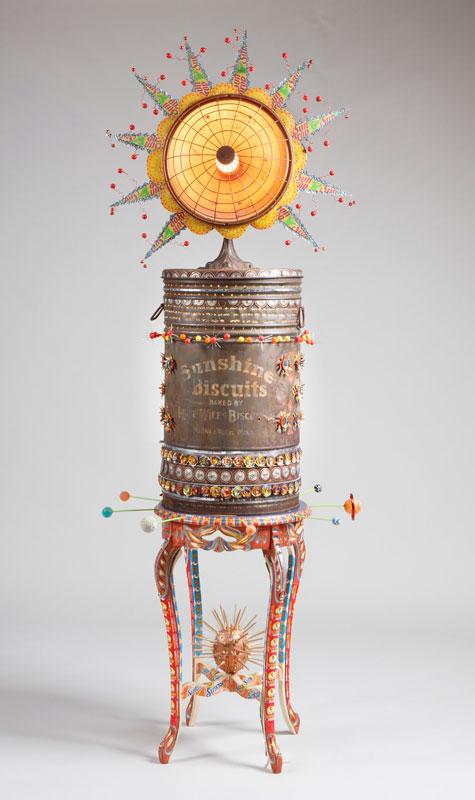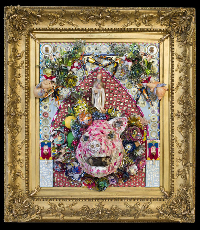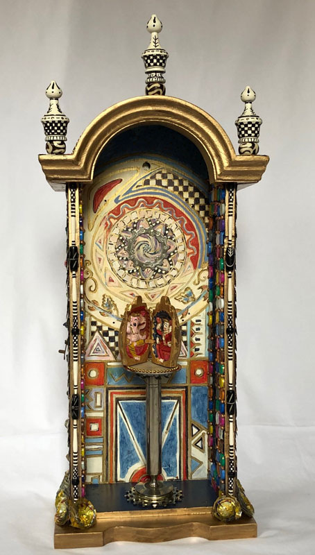 Throughout life, religion—and the study of religions—has occupied much time and thought. I was raised in a Southern Baptist home; discovered Native American, Buddhist and Hindu traditions and symbolism in my college years; then married a devout Catholic and was introduced to yet more traditions and symbols. All of these faith traditions find their way into my current art form of shrine building. In working with recycled and repurposed materials, I find my interest in color, line, detail, religious tradition and symbols all come together—to complete the whole. I do not see these shrines as religious items, rather I see them as invitations for contemplation and thus places of reflection for the viewer. My shrines draw from a lifetime of observations, meditations, and contemplations—all presented with a little dose of whimsy.