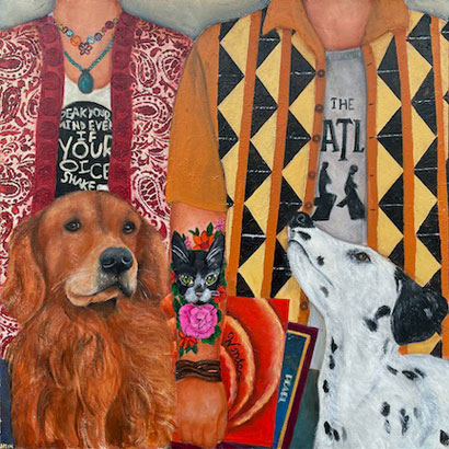 My recent paintings are influenced by my career as a graphic designer, my interest in textile design and Northern Renaissance and Flemish art history. Combining typography, stencils and texture with strong definition of form and spatial effects blurs the boundaries between commercial art, craft and fine art. My technique is an updated version of the Flemish School’s layered approach to painting. I begin with a graphite sketch. Followed by layers using water-based paints creating mid-tones, shadow and texture. The final layers are oil paint beginning with umbers and ochres, then color and finishing with details and highlights. These paintings are from my series Affinities. Affinity is defined as “a spontaneous or natural liking or sympathy for someone or something.” The paintings are not portraits in the traditional sense, but they portray the individual by depicting the things they cherish. In my work I emphasize the beauty in the world around us as well as the things we have in common rather than the issues that divide us. I'm inspired by one of my favorite quotes by Maya Angelou: “We are more alike, my friends, than we are unalike.”