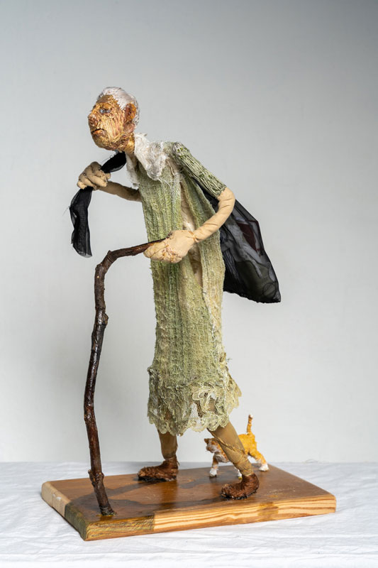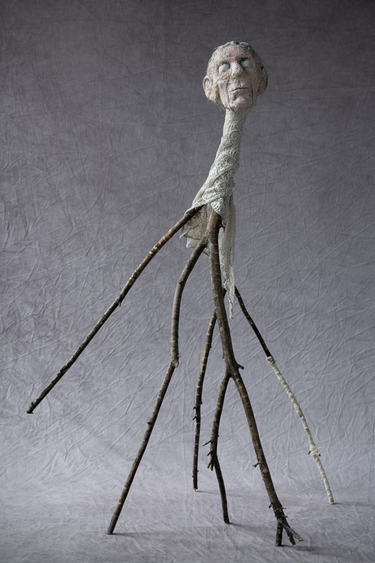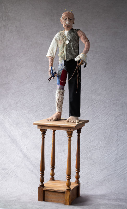 My degrees are in printmaking and drawing. However, I consider myself a multimedia artist and the skills in these disciplines inform the figurative sculptures in my recent work. The forms are created from wood or wire armatures and then the figure is built utilizing papier-mâché, cloth, glue, twine, thread and wet medium. The buildup of sewn thread and twine are akin to the marks I might add to a drawing, and provide not only texture and movement but are also meant to create pathos for the characters I create. The roughness of the surfaces is a metaphor for how life scars the body and soul and the build-up of thread and cloth patchwork in certain areas is indicative of the constant self-mending, self-critiquing and reevaluation of my life and art.