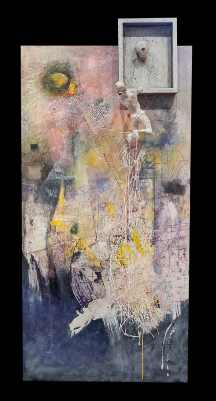 Found wood, cloth, modeling paste, acrylic, yarn, thread