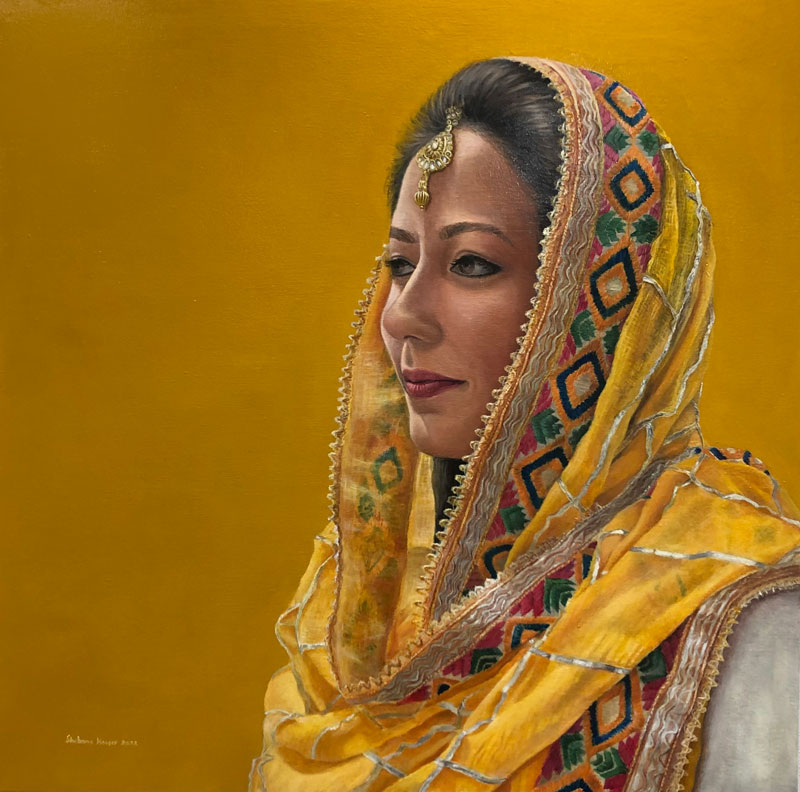 As a contemporary painter, I create portraits, still life, and floral paintings, that deeply explore South Asian representation through a blend of traditional and nontraditional compositions.My work begins with the use of my own fabrics, jewelry, and fresh florals, allowing me to stage compositions rich in cultural significance and memories.