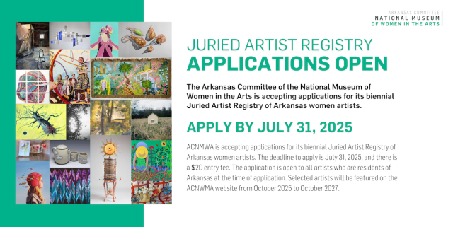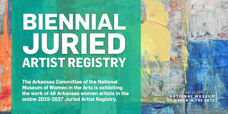The Arkansas Committee of the National Museum of Women in the Arts (ACNMWA) is exhibiting the work of 48 Arkansas women artists in the online 2025-2027 Juried Artist Registry here. Juror Carey Voss, Curator of Exhibits at the Historic Arkansas Museum in Little Rock, selected the artists for inclusion in this biennial registry. The call for applications ran from June to August and was open to all artists who identify as women and reside in Arkansas.