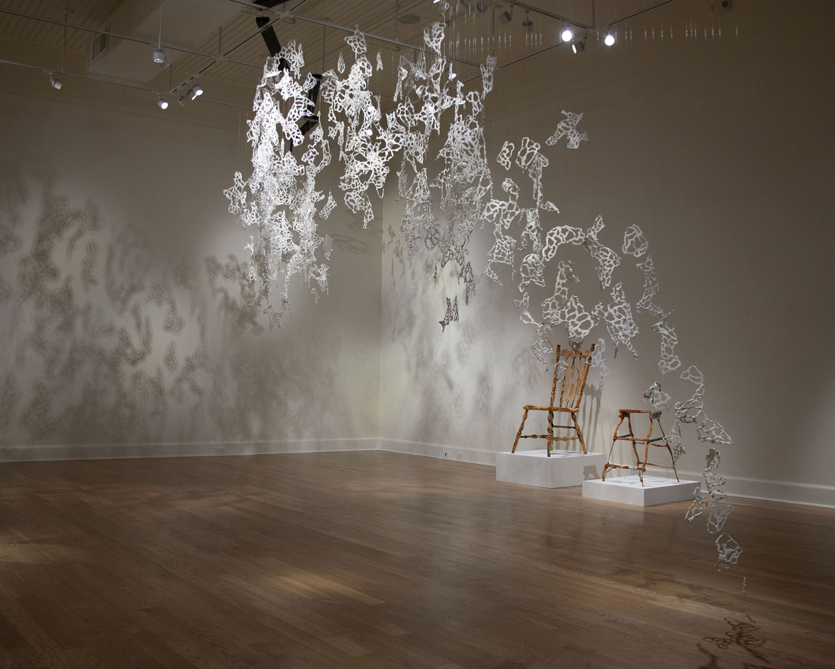 I had limited mobility and strength for the first four months after my surgery and had to look for alternative solutions for creating artwork. Sewing, welding, and woodworking were not an option. My studio practice took on an explorative nature and I experimented with new mediums and used digital fabrication (3D modeling, 3D printing, CO2 lasers, CNC routing). I had always viewed digital fabrication as a tool, but this ability to accommodate my disability gave me a new level of respect. As I worked, I saw old motifs of my work resurface and explored them translated into new mediums, which led to extraordinary discoveries and opportunities.